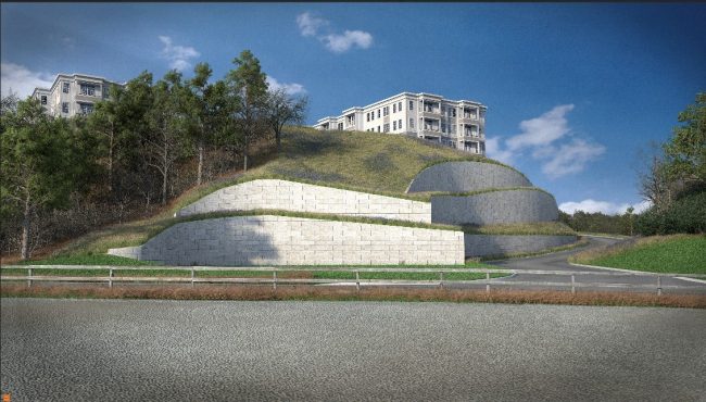 Below is the applicant’s architects’ rendering with annotations from our own architect noting the inflated size of the installed trees (are they really installing trees 20-30 feet tall?), and the actual heights of the block walls, reaching a total of 42 vertical feet in some locations.